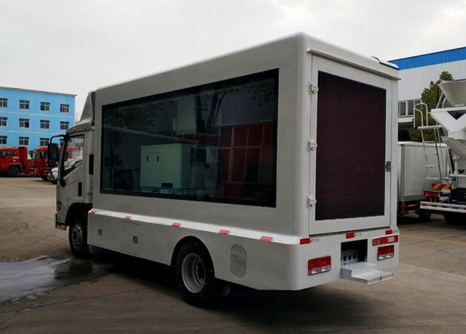 1.廂體一側(cè)采用P6戶外LED全彩顯示屏,屏幕尺寸為:3840x1760mm(6.8㎡);另外一側(cè)標(biāo)配為單色條屏和燈箱廣告,內(nèi)設(shè)滾動式裝置,可完成3-7副圖片的切換,也可以選擇安裝P6戶外全彩LED顯示屏。主LED顯示屏,可通過液壓舉升系統(tǒng)向上舉升1.5米并設(shè)有安全鎖閥,**屏幕的舉升。