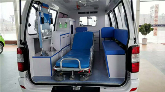 車輛內部經改裝,鋪裝了救護專用地板、中間隔墻、配備了前后對講系統(tǒng)、診療工作臺及醫(yī)藥柜、集中供氧系統(tǒng)、上排風、滴流瓶架、頂部扶手、